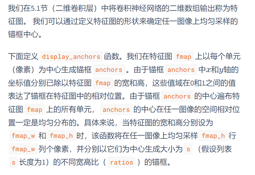 然后下午的时候背完单词都快4点了,就开始看专业课的东西。今天把第9章计算机视觉的9.3、9.4和9.5给看了,就,目标检测和边界框、锚框还有多尺度目标检测。讲真深度学习真不是我这种没脑子的人学的诶,每天都是硬着头皮看。咱就是说,它咋这么难呢?今天看的也迷迷糊糊的其实,尤其是最后多尺度目标检测那块,看到最后这里我是彻底的沦陷了。不过这块一直是将目标检测时候对边界框怎么处理优化,其实还是属于目标检测的基础知识。我对自己的定位是,能大概看懂,看到能用,不会知道去哪里查就行了。真的所有知识都知其然,知其所以然的话,我可能这辈子也学不会了。。