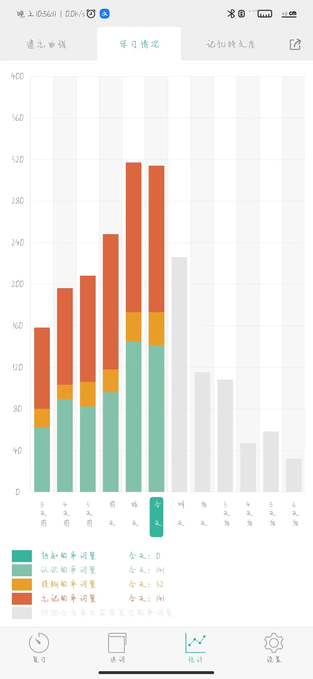 早上如昨天所说,早起做了核酸。然后回来想背会单词,刚要背就吃饭了。也不知道是吃饭比每天早了的缘故还是咋样,吃完饭就贼困。然后就玩了好久手机,然后背完单词好像都快9:30了。说起来背单词就气,本来以为今天能少背呢。没想到我失算了,它墨墨那个图的意思是,预计我要复习200多个,还要加上每天新学的100个呢!就是说今天也是300多个。看到300多个我现在都有点犯怵了。可能也是因为这,上午就懒得背。磨磨蹭蹭背完100个。然后中午起来,又是想1:40起,又没起来。可能有起床气吧,背单词也背不会。就很烦。烦着烦着,反正也背完了100个,背完玩了会手机都4点了。状态不好加上起不来,真的是太要命了。而且还不能不睡,不睡这一下午一晚上头都是疼的。更难受!唉!然后,晚上状态还行,屁颠屁颠的,45分钟把100个新单词背完了。总结一句就是今天单词背的不痛快,追其原因就是没睡醒,迷糊。晚上状态好是因为不是睡醒就背单词的。等解封吧,我早上就出去溜达半小时,然后再回来背单词,应该会好很多吧!