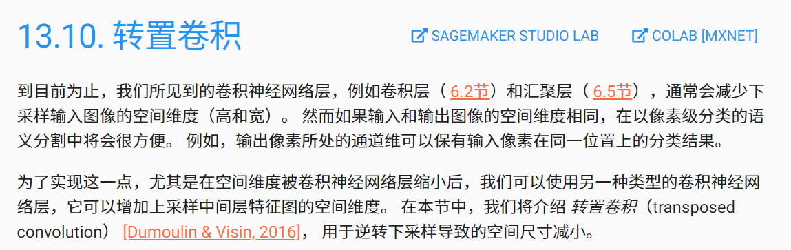 然后刚才也说了下午背完单词都4点了。所以学专业课时间又少了。就剩下一个多小时。然后就看了两小节。语义分割和数据集、转置卷积,不过还好。今天看的基本上,基本上懂了。比昨天看的懂的明白了,昨天那是真看不懂,今天起码有眉目。这个转置卷积就是反卷积,我理解的呢,反卷积就是用来上采样的,上采样是啥呢,上采样其实就是升维。为啥要升维呢?因为卷积的时候降维了,为啥降维了呢?因为卷积时候下采样了,就是为了提取图像的特征,所以把维度降低,更有利于提取特征吧。但是因为语义分割和目标检测不一样,语义分割给每个像素都分类。卷积操作时候维度给人家降了,那肯定不行,所以就得反卷积给升维升回来。哎呀,大概应该就是这个意思吧。先学着,如果不对,后面有新的理解就再补充回来,嘿嘿。